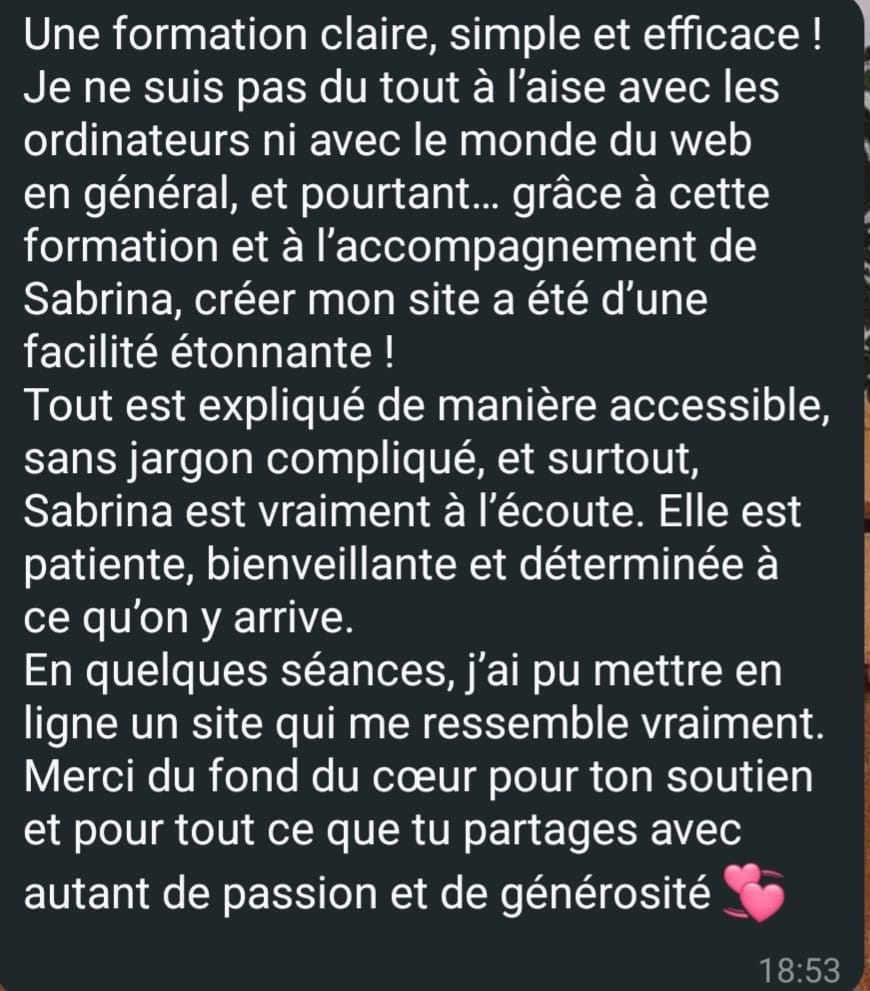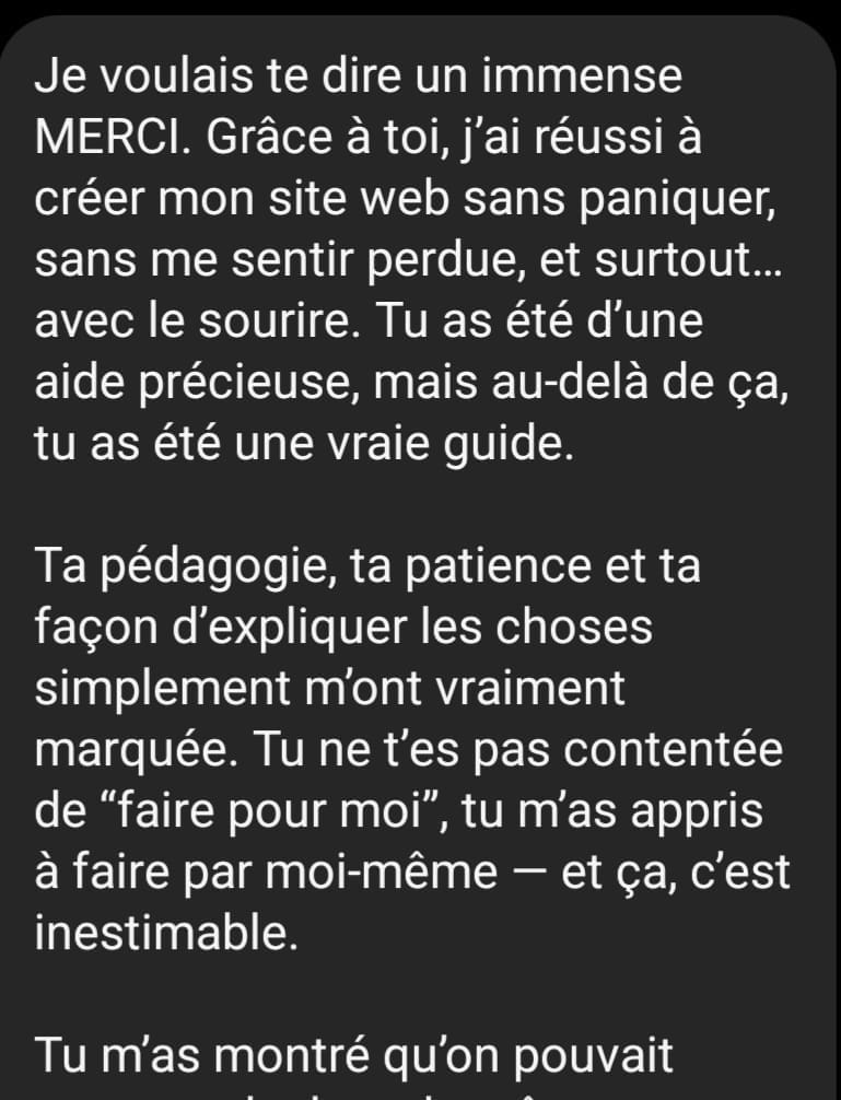 Tu sauras mettre ton site en ligne, le partager avec ton entourage ou tes prospects, et te sentir fière d’avoir tout fait toi-même.